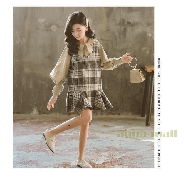 ワンピース キッズ 長袖 子供服 女の子 春秋 キッズワンピース 2点セット チェック柄 子供ドレス ジュニア お姫様 おしゃれ 可愛い カジュアル 小学生 新品 150