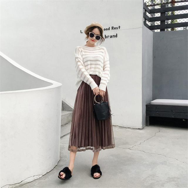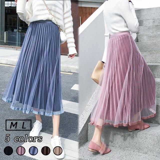 プリーツスカート ロングスカート 秋冬 レディース ボトムス チュールスカート フレアスカート ドッキングスカート 全5色 エレガント