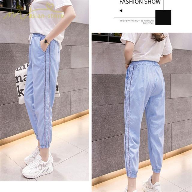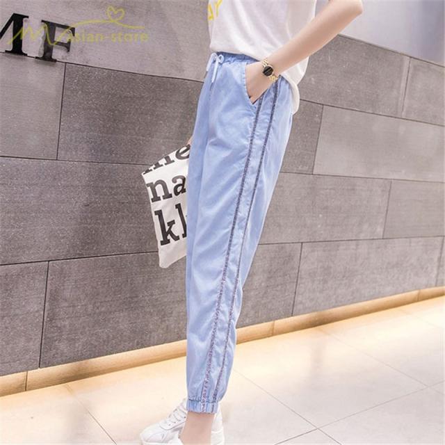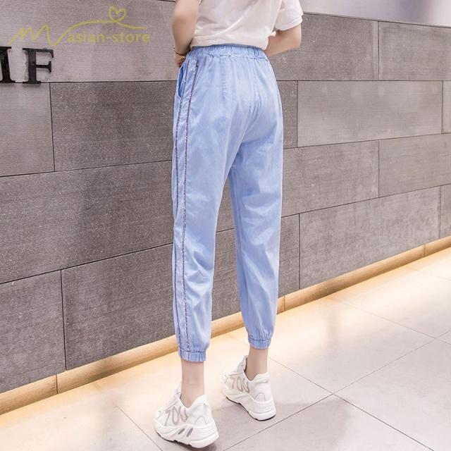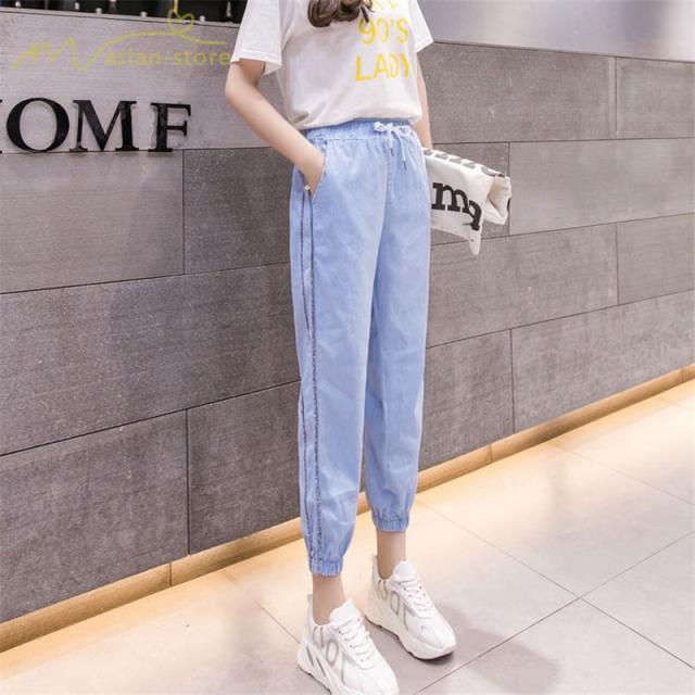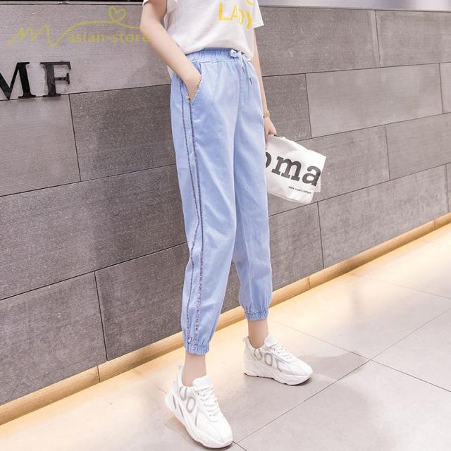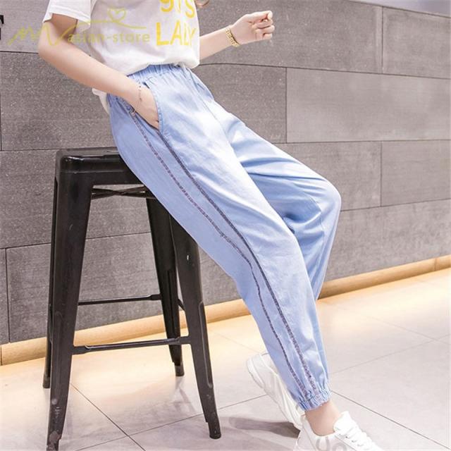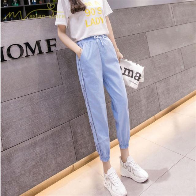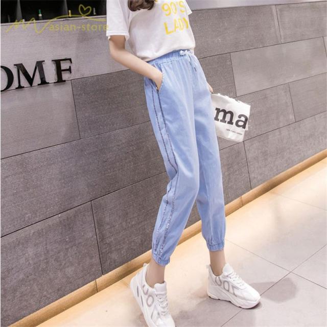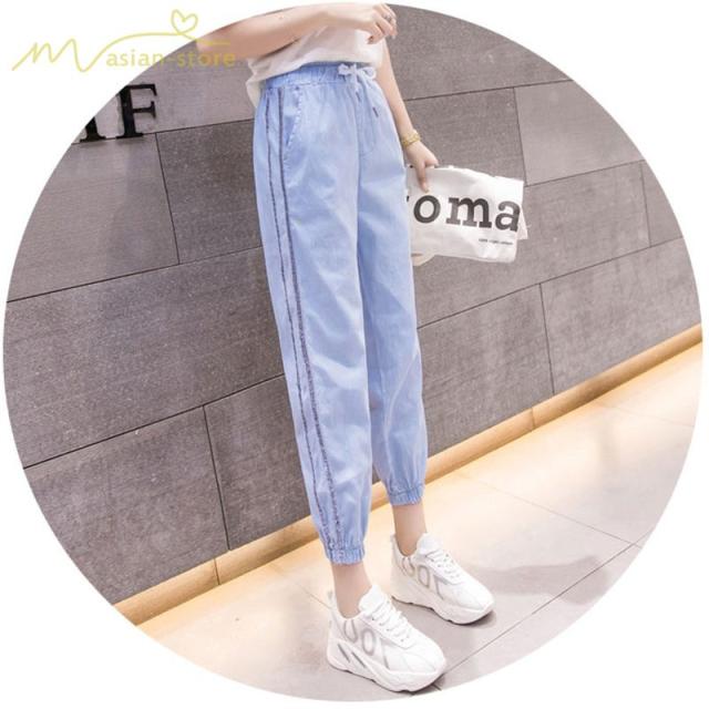 デニムパンツ サルエルパンツ 九分丈パンツ ウエストゴム ハイウエスト 韓国風 薄手 ジーンズ ストレッチ ハレムパンツ カジュアルパンツ 大きいサイズ