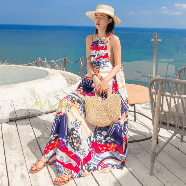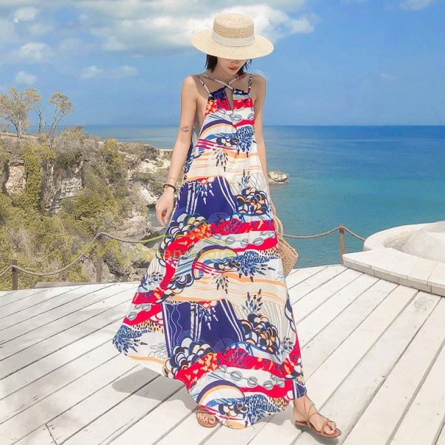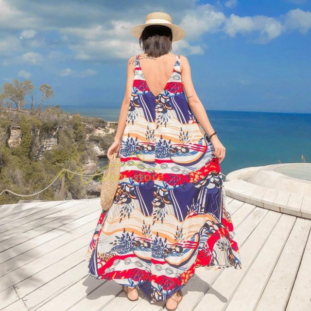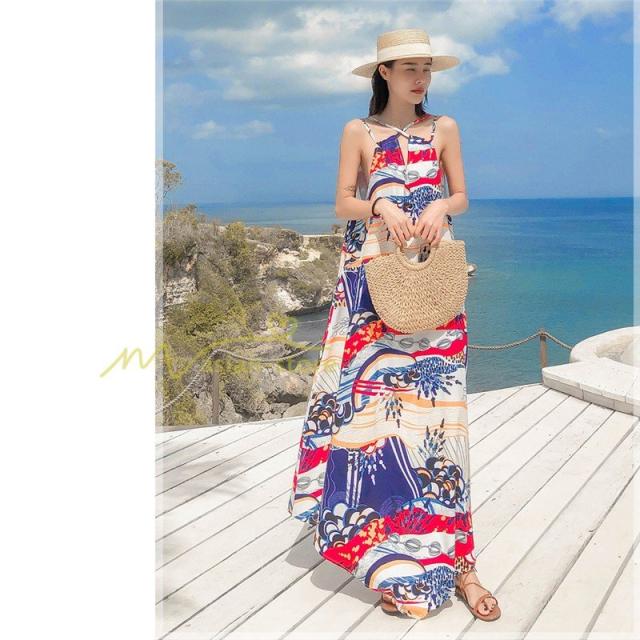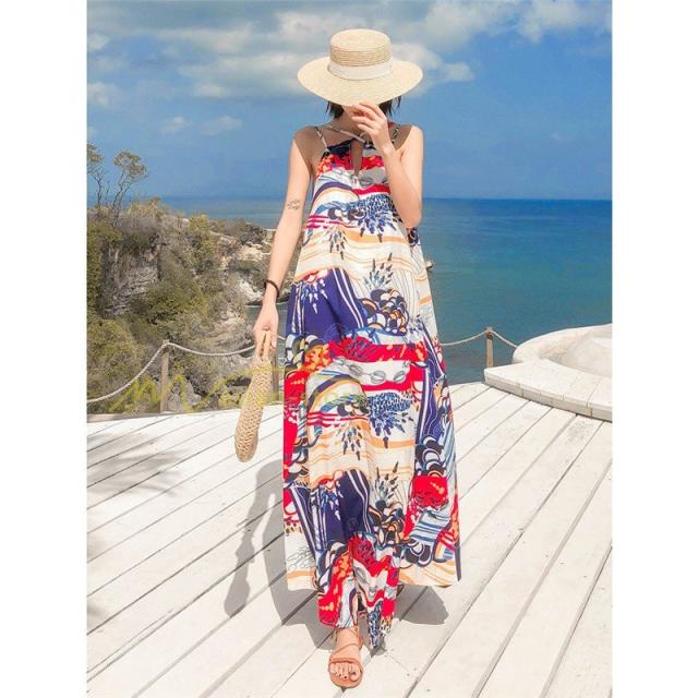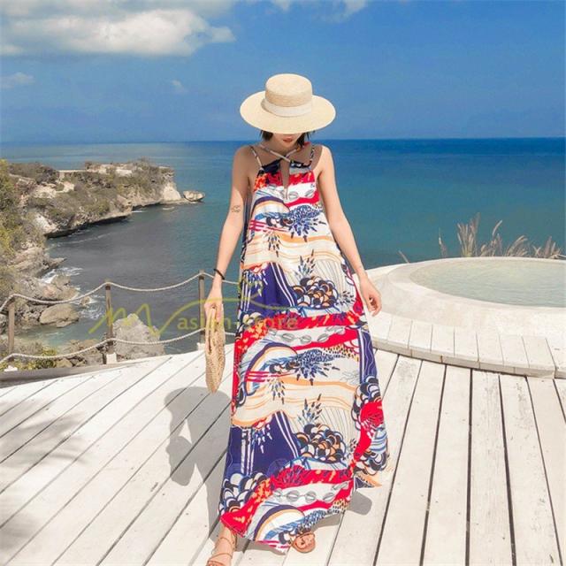 マキシワンピース リゾートワンピ 背中開き レディース キャミソール ノースリーブ セクシー ゆったり プリーツフレア カジュアル 柄ワンピース 体型カバー