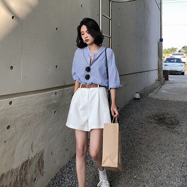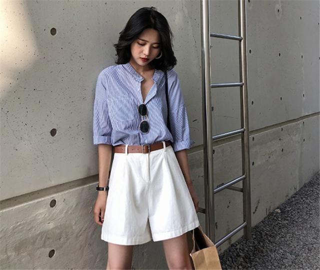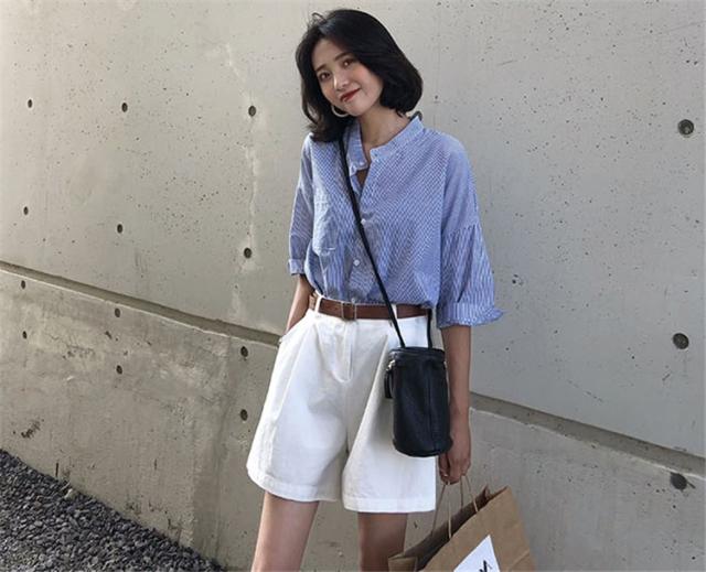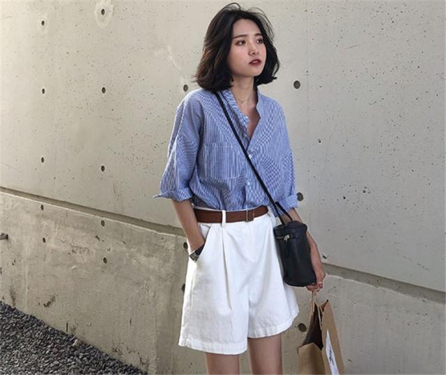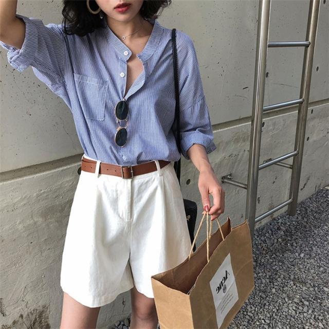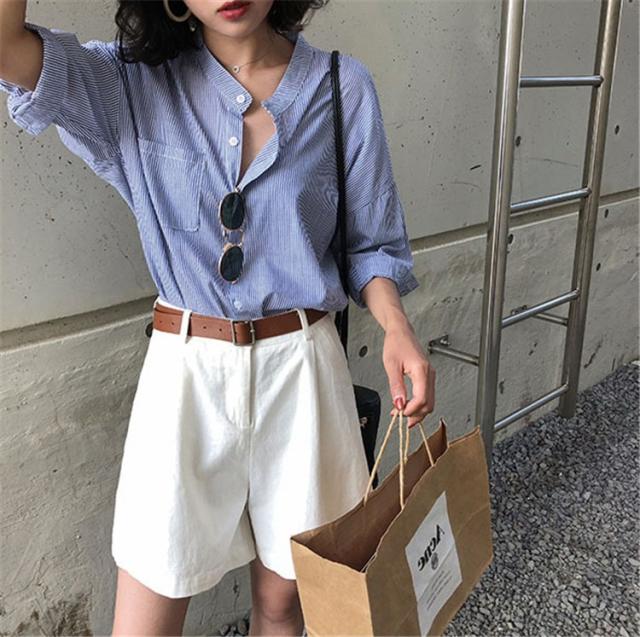セットアップ レディース 夏 カジュアル 40代 20代 おしゃれ 上下セット シャツ ブラウス 半袖 ストライプ ショートパンツ 大きいサイズ 韓国風 着痩せ 通勤 OL