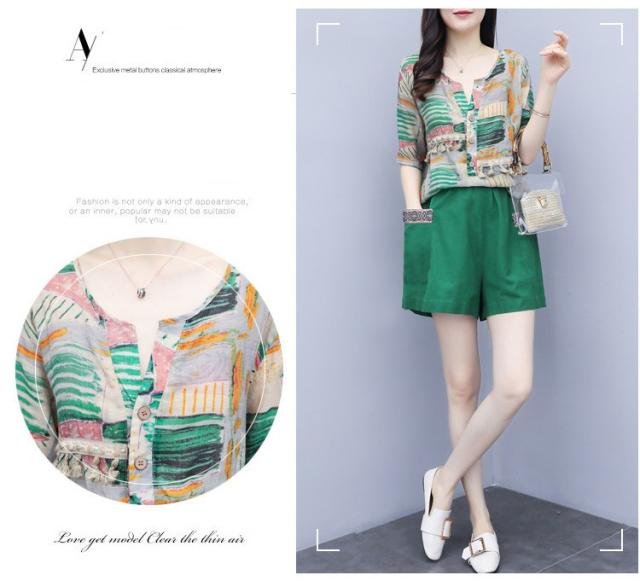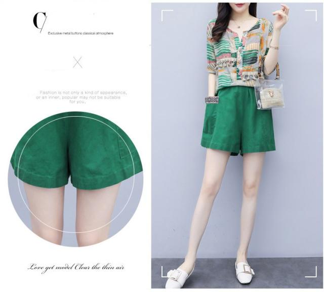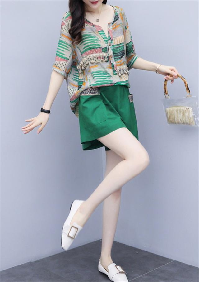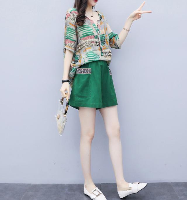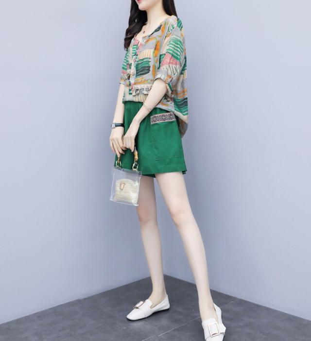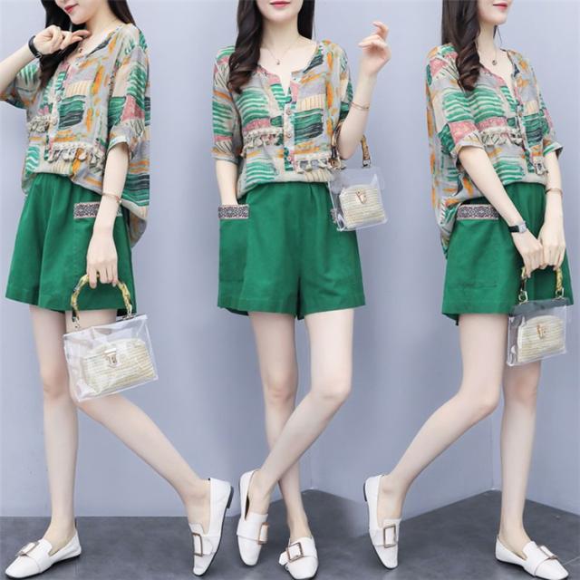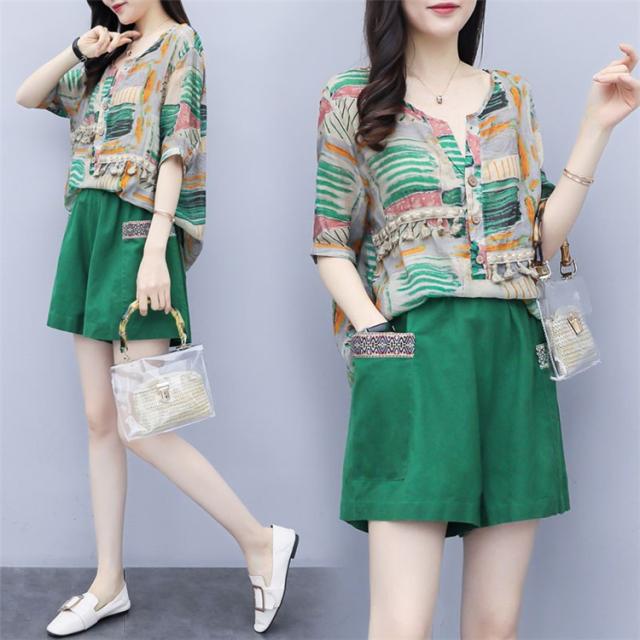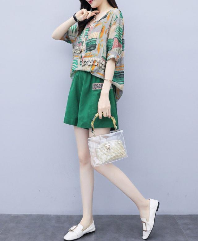 セットアップ レディース 40代 30代 春夏 カジュアル 2点セット 上下セット Tシャツ 半袖 Vネック 花柄 ショートパンツ 綿麻 大きいサイズ おしゃれ 着痩せ 新品