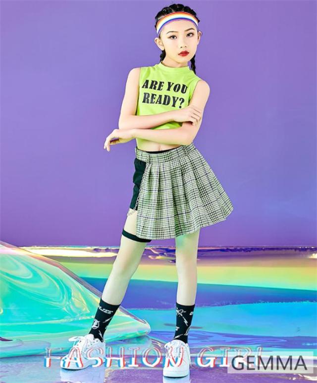 子供ダンス衣装 女の子 ミニスカート グリーン タンクトップ へそ出し キッズダンス衣装 ヒップホップ 応援団 イベント 日常 hiphop ジャズ