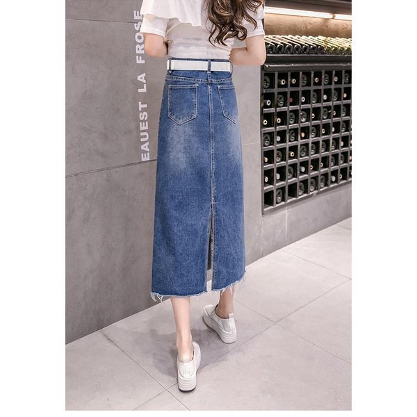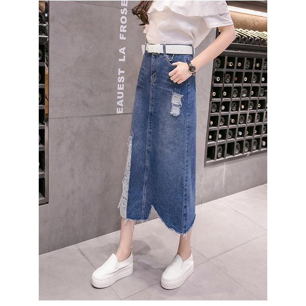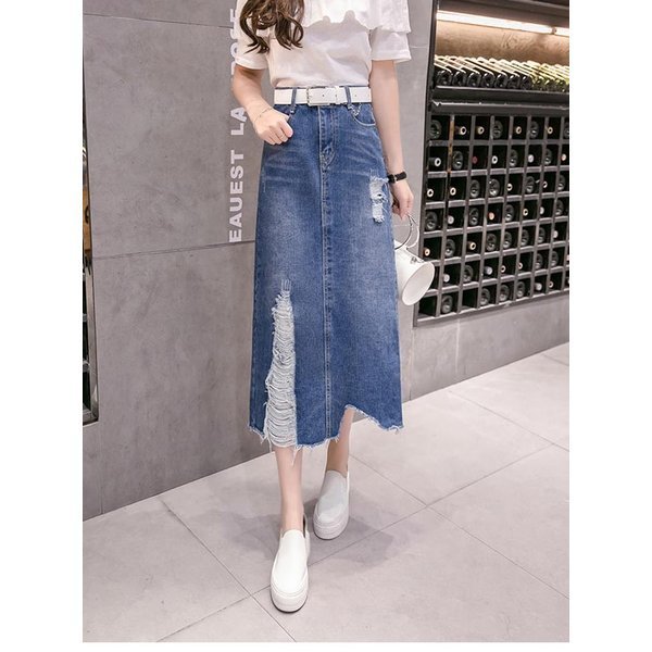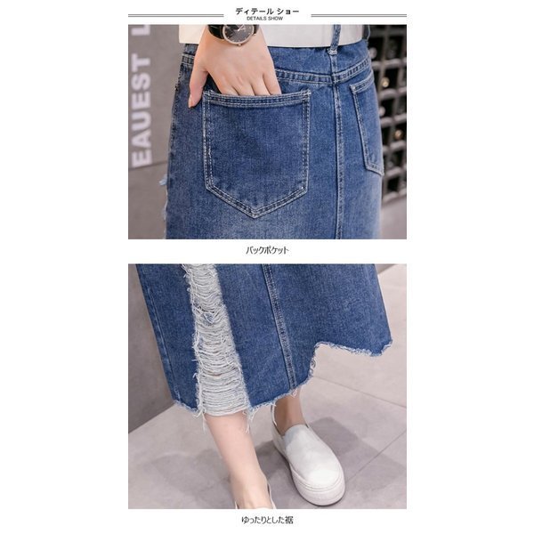 レディース デニムスカート ダメージ加工 ロング丈 マキシ丈 切りっぱなし ハイウエスト オシャレ ボトムス 春 夏 秋 2019春新作