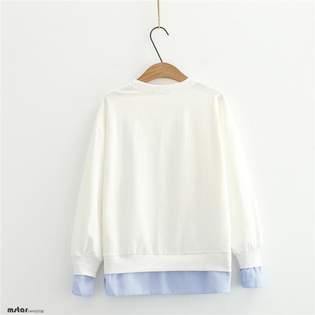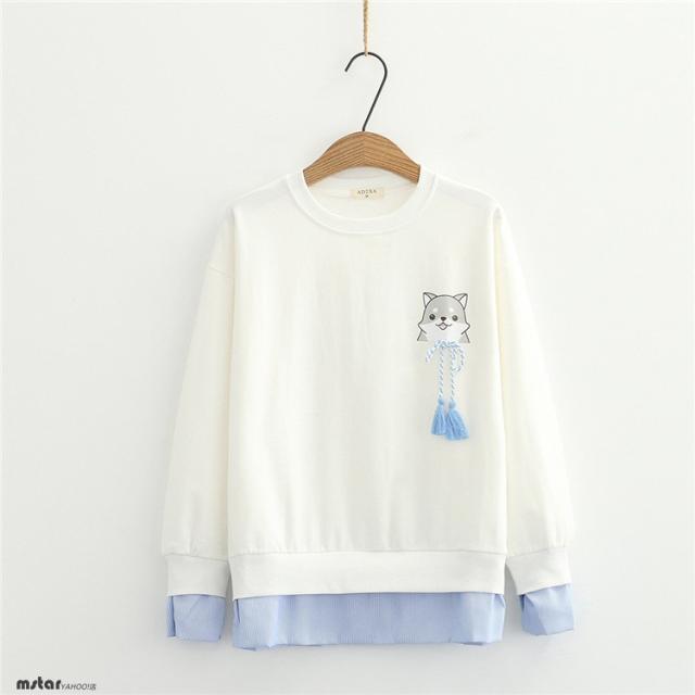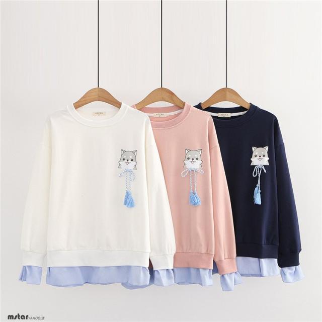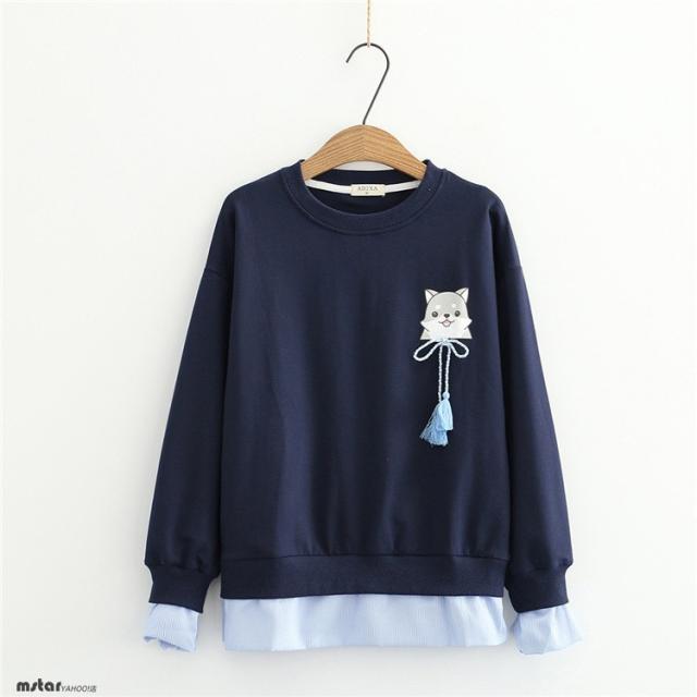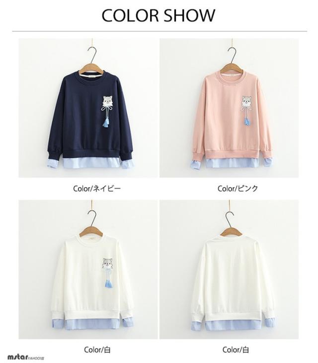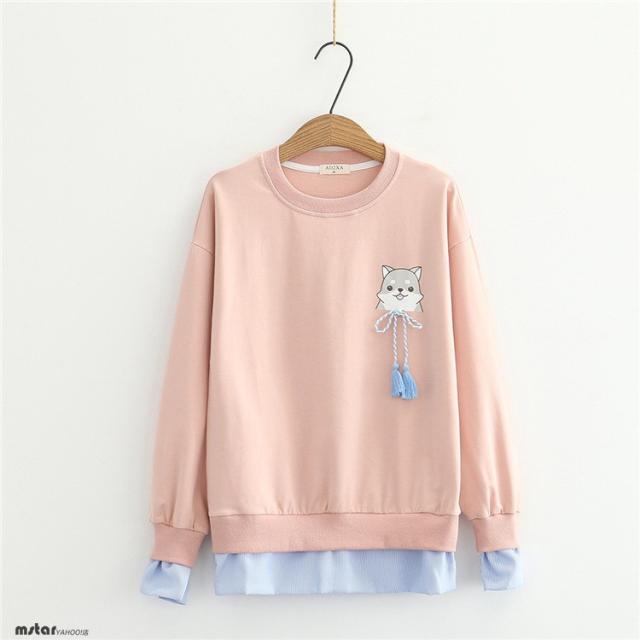 トレーナー レディース トップス フェイクレイヤード 犬柄 グルーネック タッセル 大きいめ かわいい カジュアル 秋服