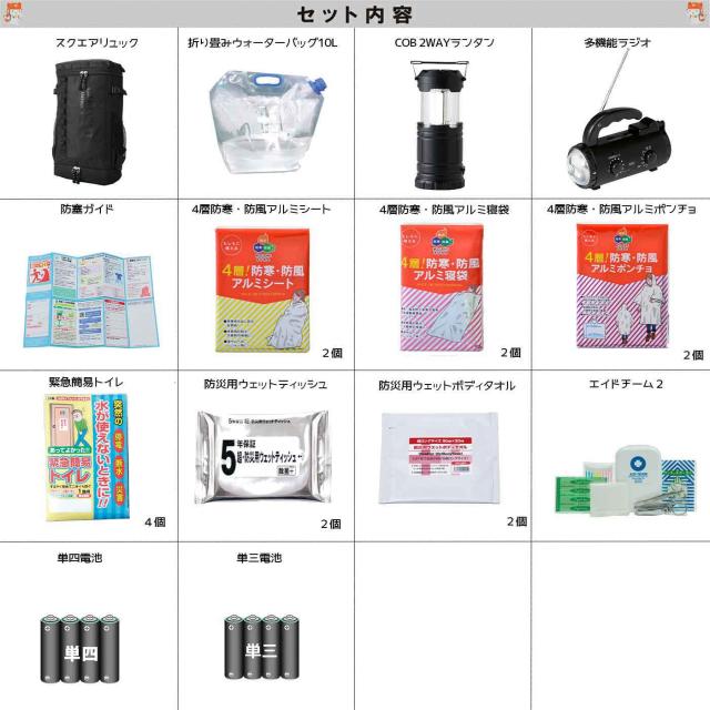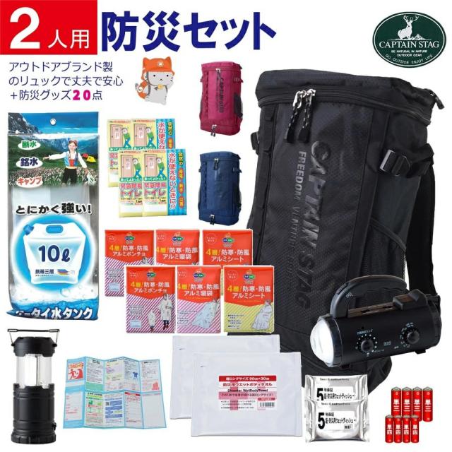 送料無料防災セット 2人用 21点 CAPTAIN STAG スクエアリュックサック タイプ BOS-10