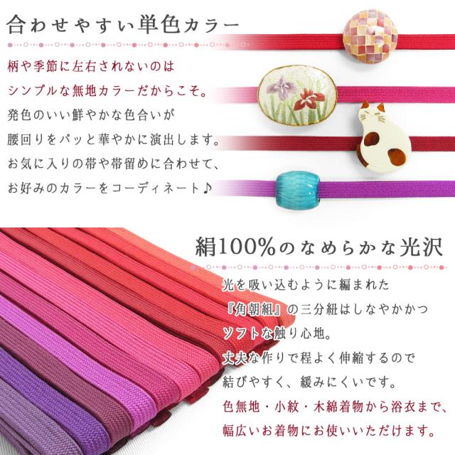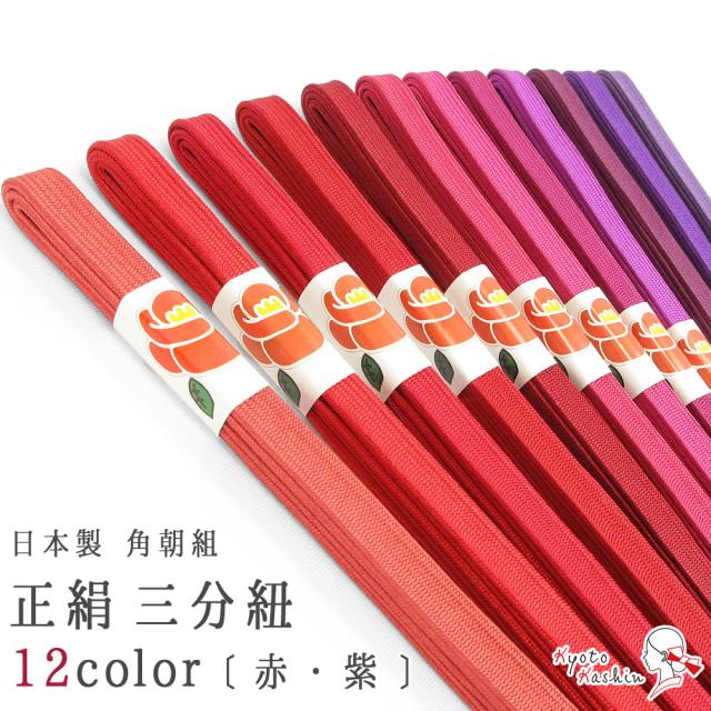 【10本までメール便送料無料】高級 正絹三分紐 帯締め 絹100% 伝統的工芸品 角朝組 日本製 巾9mm 並尺 約117cm 3分紐 12色 カラフル 赤 紫 和装小物 着付け小物 レディース 女性 通年用 お洒落 カジュアル 着物 訪問着 付け下げ 色無地 小紋 紬 デニム着物 浴衣 夏着物