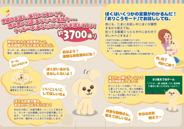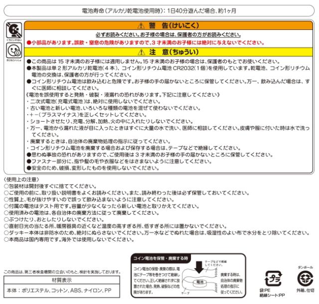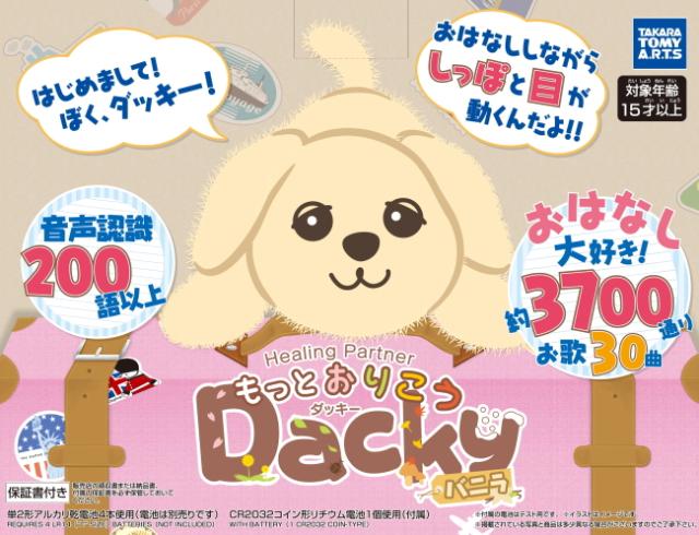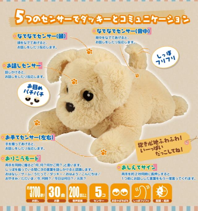 旧ダッキー商品よりとってもおりこうになり、お話3,700通り以上、音声認識200語以上(新機能)、しっぽふりふり機能(新機能)など機能が盛り沢山になりました。おはようからおやすみまで季節や時間に合わせたお話をしてくれるダッキー。抱きごこちもふわふわで、あなたのそばでお話相手をしてくれます。