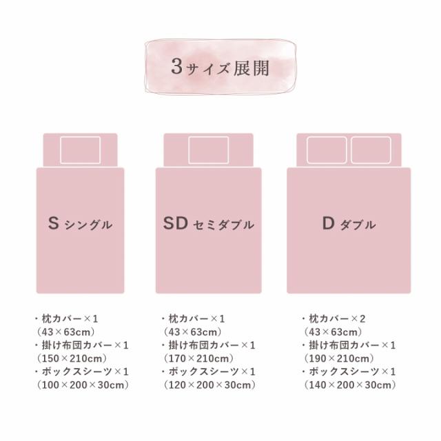 | サイズ | 〈枕カバー〉約43×63cm 〈掛け布団カバー〉約170×210cm(セミダブル) 〈ボックスシーツ〉約120×200×30cm(セミダブル) |