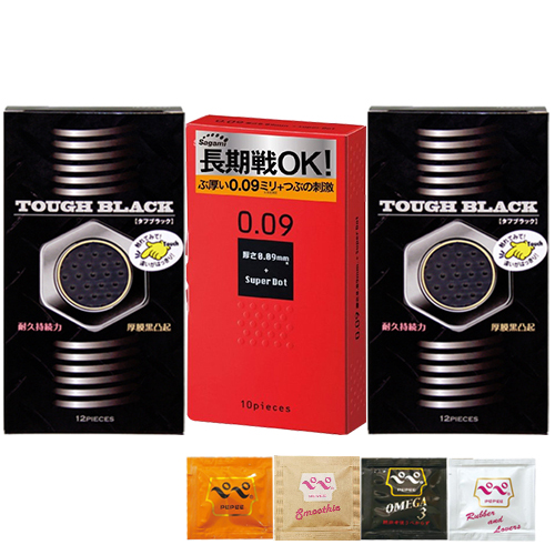 ◆【ロングプレイ 極厚 つぶつぶ コンドーム】コンドーム 3箱セット サガミスーパードット009(10個入) + タフブラック(12個入)×2箱 + ペペローション(5ml)セット ※完全包装でお届け致します。