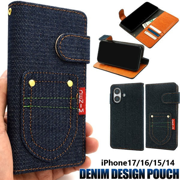 デニムデザインの iPhone17 / iPhone17 Pro / iPhone16 / iPhone16 Pro / iPhone14 / iPhone14 Pro / iPhone13 手帳型ケースです。