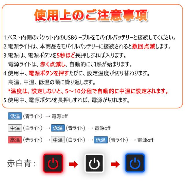 4.ベストのスイッチを3〜5秒押すと加熱OFFになります。