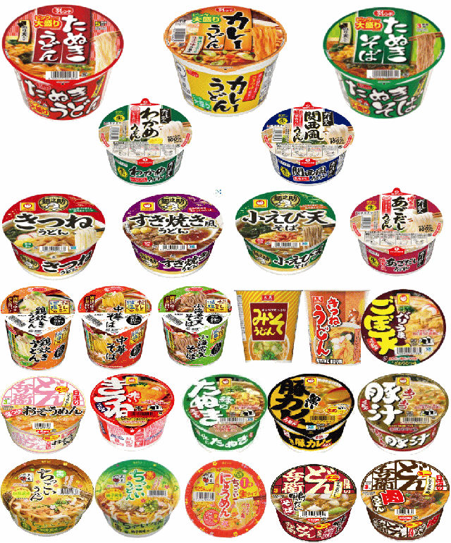 大盛りサイズから、レギュラーサイズ、ちょっと食べたい時のミニサイズまで揃えたセットです。おうどん。お蕎麦好きの貴方には最適ですね。24種類でお届けします。