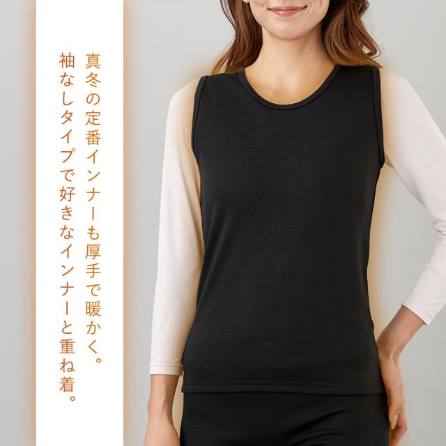 肌触り良いふかふかな裏起毛。一枚でも十分に暖かい厚手タイプのありそうでなかった袖なしタイプ。