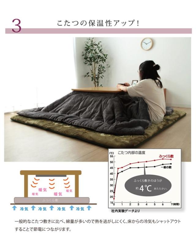 一般的なこたつ敷きに比べ、綿量が多いので熱を逃がしにくく、床からの冷気もシャットアウトすることで節電にも貢献。