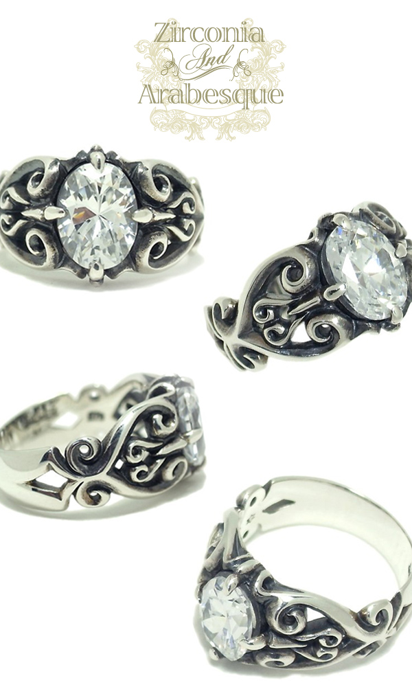 美しい唐草模様がジルコニアの輝きを際立たせる、とてもオシャレにデザインされたリングです。