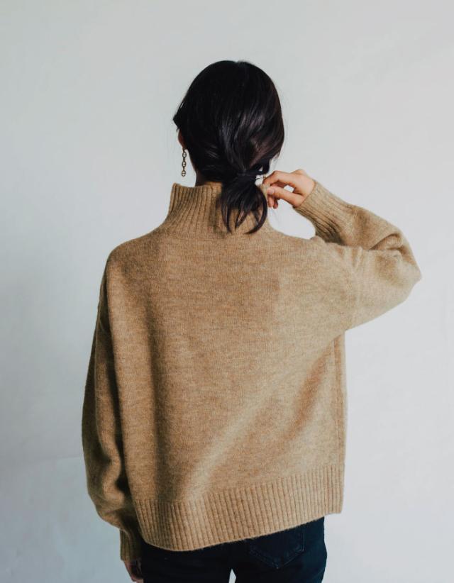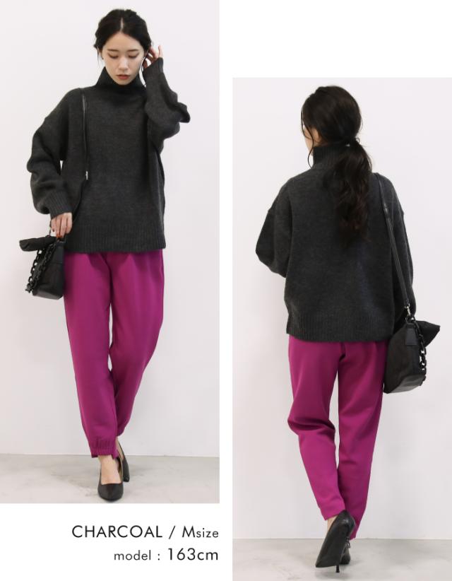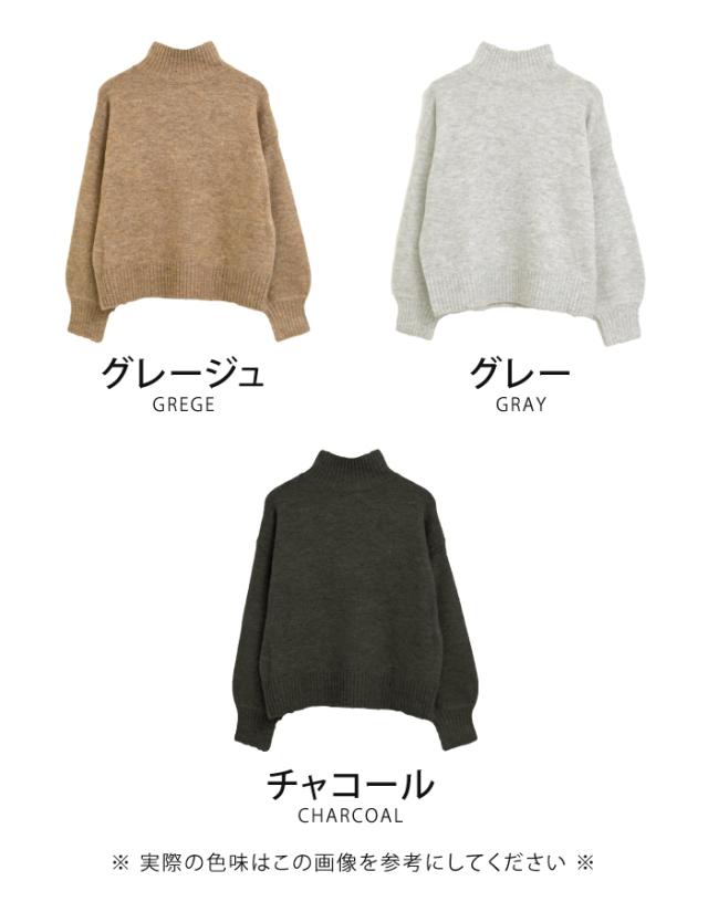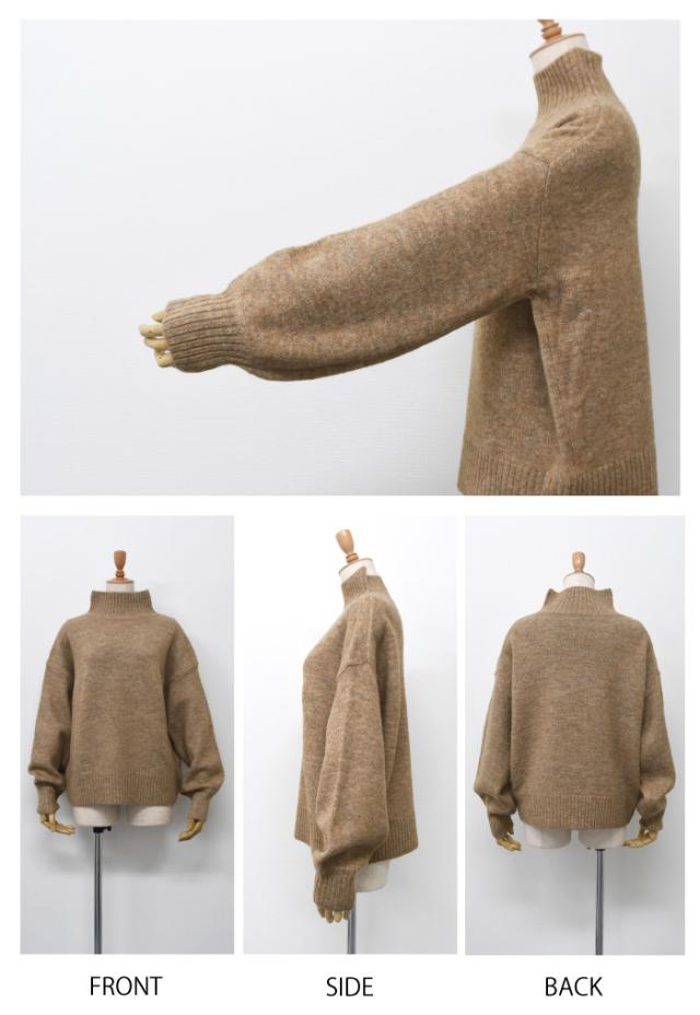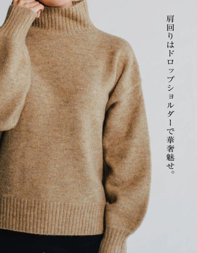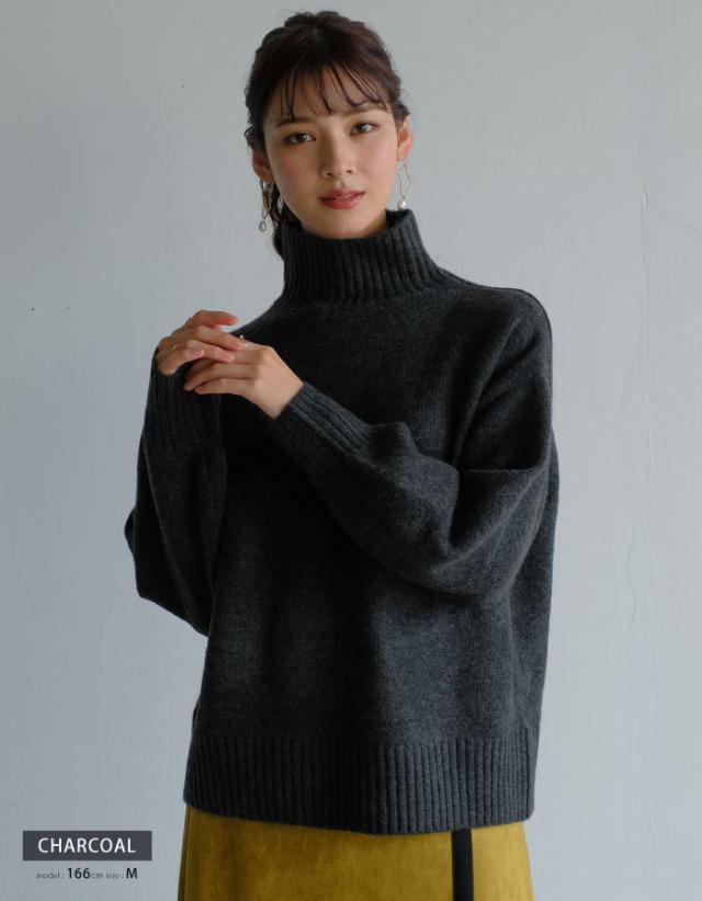 ゆとりのあるシルエットのボトルネックボリューム袖ニット トップス。