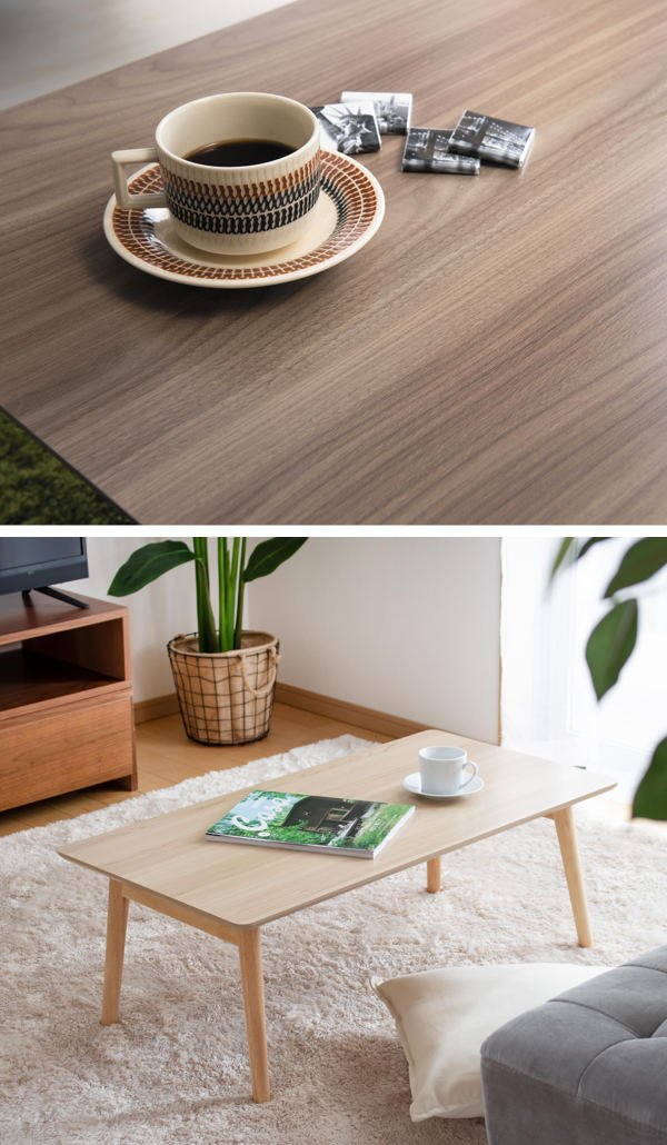 天板はおしゃれな木目調のデザイン。お部屋の雰囲気に合わせてカラーをお選びいただけます。天板の表面はサラッとしていて文字を書きやすく、反射のしないタイプです。インテリアに馴染みやすい落ち着いたデザインなのもうれしいポイントです。