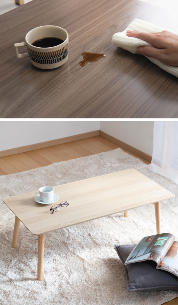 | 材質 | 本体:合成樹脂化粧繊維板(メラミン樹脂)、天然木(ラバーウッド) 塗装:ポリウレタン樹脂塗装 |