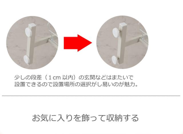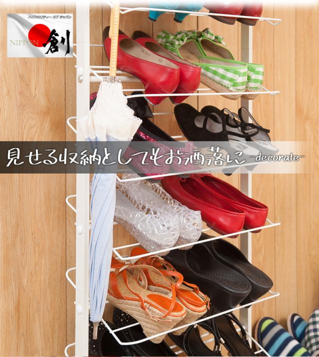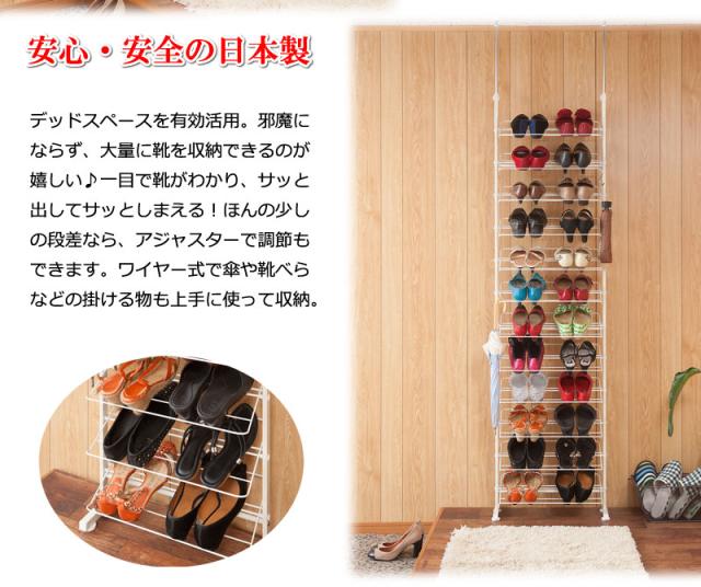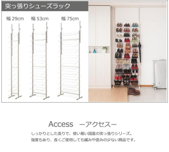 ■商品について/玄関に溢れている靴をしっかり、且つ大量収納でき、玄関のデッドスペースを有効活用できるシューズラックが登場!お気に入りの靴をおしゃれに飾ることで、毎日のお出かけが楽しくなること間違いなし!奥行が22.5cmと省スペース設計でデッドスペースに最適!更に12段あるので収納もしっかり!棚を斜めにすることで奥行をとらず、靴を取り出しやすく、見やすくおしゃれに収納できます。また、ワイヤー式なので靴べらや傘などをかけることができ、とても便利。低めの玄関框をまたいだ状態でも設置できるように微調整可能なアジャスターがついており、更に突っ張り式で安心。安全の日本製。幅29cm・53cm・75cmの3種類。玄関だけでなくお部屋にインテリアとしてもディスプレイ感覚でショップ風にキメる!