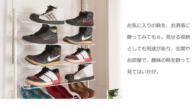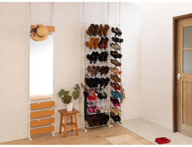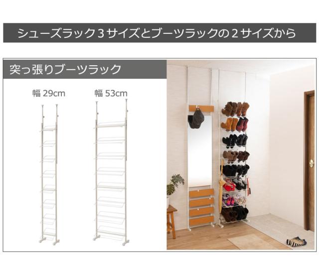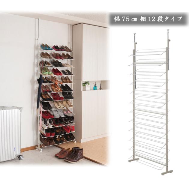 ■商品について/玄関に溢れている靴をしっかり、且つ大量収納でき、玄関のデッドスペースを有効活用できるシューズラックが登場!お気に入りの靴をおしゃれに飾ることで、毎日のお出かけが楽しくなること間違いなし!奥行が22.5cmと省スペース設計でデッドスペースに最適!更に12段あるので収納もしっかり!棚を斜めにすることで奥行をとらず、靴を取り出しやすく、見やすくおしゃれに収納できます。また、ワイヤー式なので靴べらや傘などをかけることができ、とても便利。低めの玄関框をまたいだ状態でも設置できるように微調整可能なアジャスターがついており、更に突っ張り式で安心。安全の日本製。幅29cm・53cm・75cmの3種類。玄関だけでなくお部屋にインテリアとしてもディスプレイ感覚でショップ風にキメる!