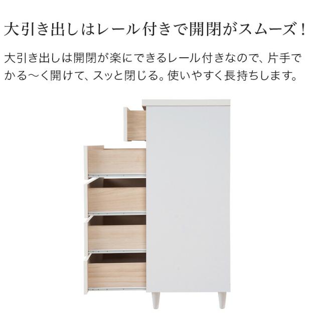 大引出しはスライドレール付きでスムーズに開閉します。スタイリッシュに仕上がったチェストは脚の丸みがこだわり。真っ白のチェストは圧迫感なくそれでいて存在感あり。