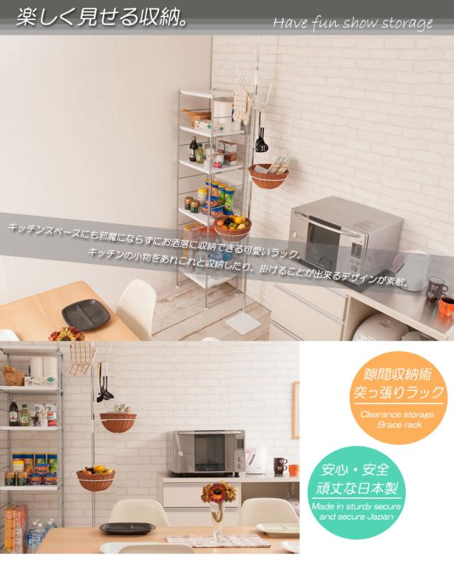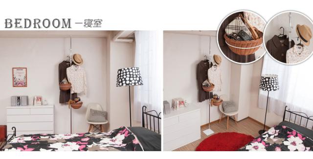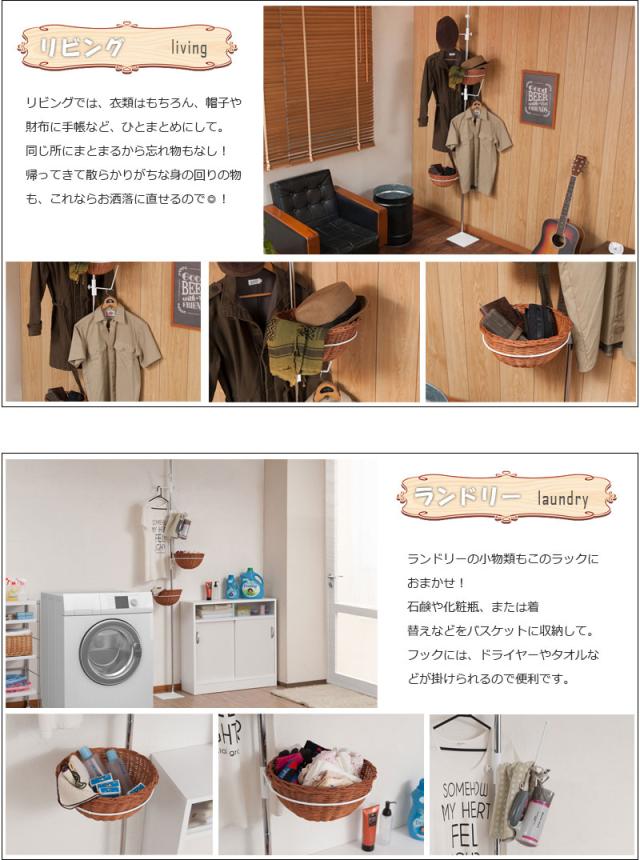 ポールに丸いラタンバスケットが2つとフックが2つ付いて、それぞれ高さ調節はもちろん360度向きも変えられるので収納アレンジ自由自在。精度の高い日本製で、天井にもしっかり突っ張れるから安心。キッチンや玄関、リビング、子供部屋など使い方は無限大!白とラタンの配色が可愛く、バスケットを持ち運びできるのも嬉しいポイントです。