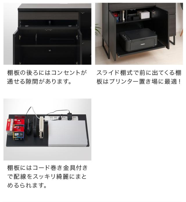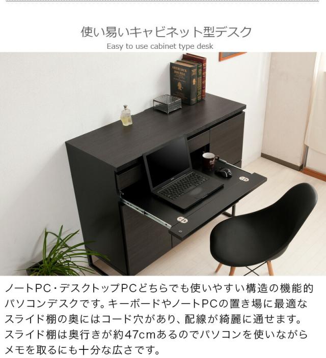 書斎机 パソコンデスク 黒 幅106cm 木製 完成品 日本製 キャビネット 北欧 デスク 脚 付き おしゃれ オフィス 書斎 収納付き スライド棚 モダン 黒 コード穴付き 配線 ルーター プリンターの収納に 幅110cm ブラック 重厚感 /通販/送料無料 組立不要