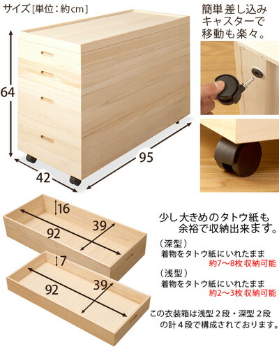 桐衣装箱 幅95高さ64 ハイタイプ (キャスター付き)4段 日本製 押し入れ/押入れタンス/着物/収納ケース/衣類の収納に最適な桐材/完成品 国産品/木製/薄型/通販/送料無料 【送料込み】 新生活 組立不要