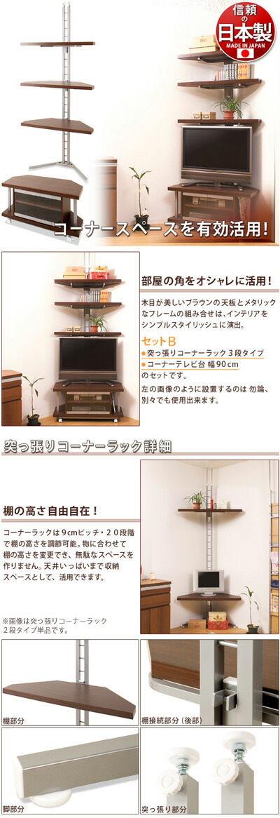 コーナーテレビ台セットB つっぱりコーナーラック3段+テレビ台90幅 シンプル ダークブラウン コーナーラック 幅90cm スチール メタルラック 省スペース 突っ張り式 ローボード 木製/薄型/通販/送料無料 シンプル 新生活