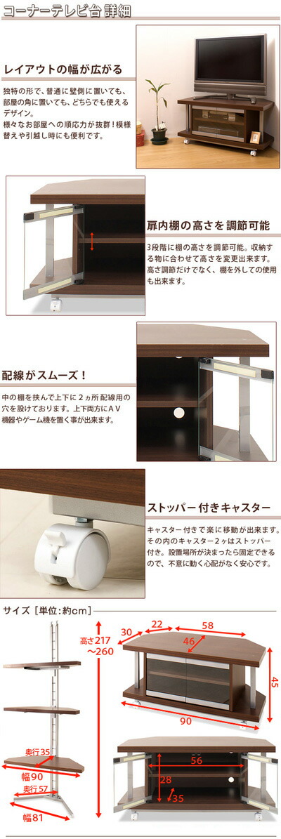 | テレビボード本体 :(約)幅90×奥行46×高さ45cm 扉内内寸 :(約)幅56×奥行35×高さ28cm コーナーラック本体:(約)幅81×奥行57×高さ217〜 260cm コーナーラック棚板 :(約)幅90×奥行35cm | ||||