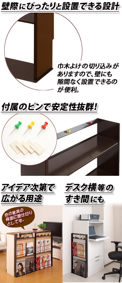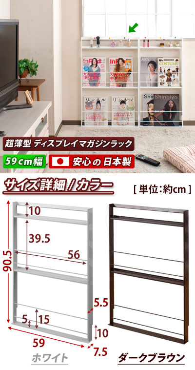 マガジンラック 幅59cm ホワイト/ブラウン スチール 日本製 薄型 スリム [送料無料] マガジンラック 雑誌ラック 超薄型 マガジンスタンド 雑誌 収納 ブックスタンド ディスプレイラック ミニラック 壁 ウォールラック 家具 スリムラック 巾木よけ 組立不要