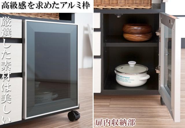 | 商品仕様 | 材質/天板:ポリエステル化粧繊維板、前板:強化プリント紙化粧繊維板、扉枠:アルミニウム、3mm厚ガラス、その他:プリント紙化粧繊維板 ■付属品/キャスター4個(内2個ストッパー)付き ■棚板/可動式1枚(3cmピッチ・3段階) |