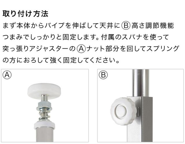 | 本体サイズ(cm) | 本体:約幅60×奥行32(脚部21.5)×高さ202〜260cm、棚板:約幅57×奥行22cm、棚間隔:約33.5cm、ハンガー下高さ:約113cm、目隠し部高さ:約182cm |