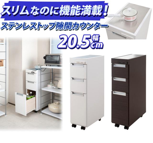 ステンレストップ隙間カウンター 幅20.5cm ダークブラウン/ホワイト 日本製 完成品ステンレス天板 スリムワゴン キッチンカウンター キッチンワゴン 引き出し引出し 国内生産 国産 組立て済/木製/薄型/通販/送料無料 【送料込み】 新生活 組立不要