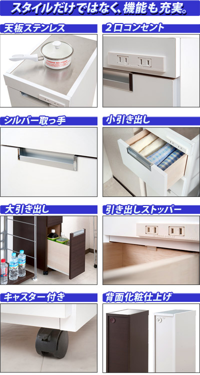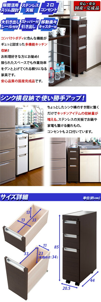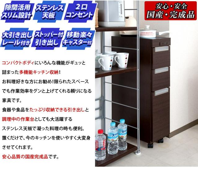 :安心の日本製 完成品 ステンレス天板 スリムワゴン シンク横の隙間を有効活用 ステンレストップ隙間カウンター キッチンの収納量が増える便利なワゴン ステンレス天板でお鍋や家電も置ける 便利なコンセント2口付きスリム 2リットルのペットボトルが収納できる キッチンストッカー 便利なストッパー付きキャスター システムキッチンと一体感が出るフラットデザインキッチンだけでなく、サニタリーなどデッドスペースにぴったりな幅3サイズをご用意 キッチンカウンター キッチンワゴン 引き出し引出し 送料無料キッチンワゴンキャスター付きローラーキャビネットサイドワゴン