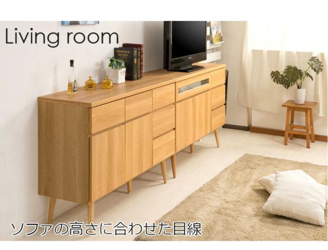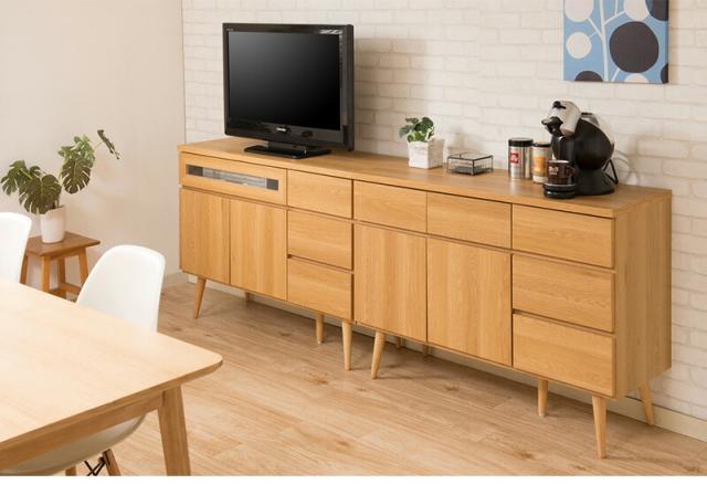お洒落な北欧テイストのTVキャビネット。スタイリッシュな脚と本体のボリュームが生む絶妙なバランス。テレビキャビネットはダイニングで椅子からでも見やすいミドル高さに設定。収納ボードとしてダイニングのあらゆるものをしまっておくのに大活躍。取っ手のないプッシュ式扉です。