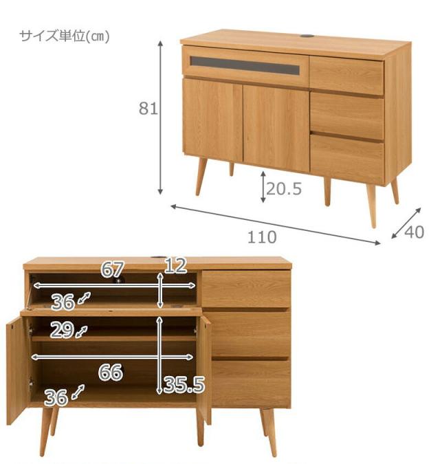 | 本体サイズ(cm) | 本体:約幅110×奥行40×高さ81(脚20.5含む)cm フラップ扉内寸/約幅67×奥行36×高さ12cm 扉内寸/約幅66×奥行36×高さ35.5cm 引内寸:約幅30×奥行33.5×深さ(浅)11.5(深)14.5cm |