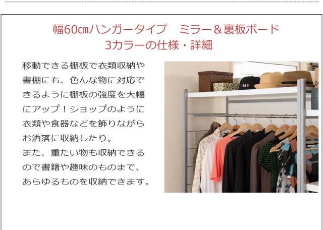 | 商品仕様 | フレーム:スチール(エポキシ粉体塗装)、棚板・ボード :プリント紙化粧繊維板、ハンガーバー:スチール(メッキ仕上げ) |