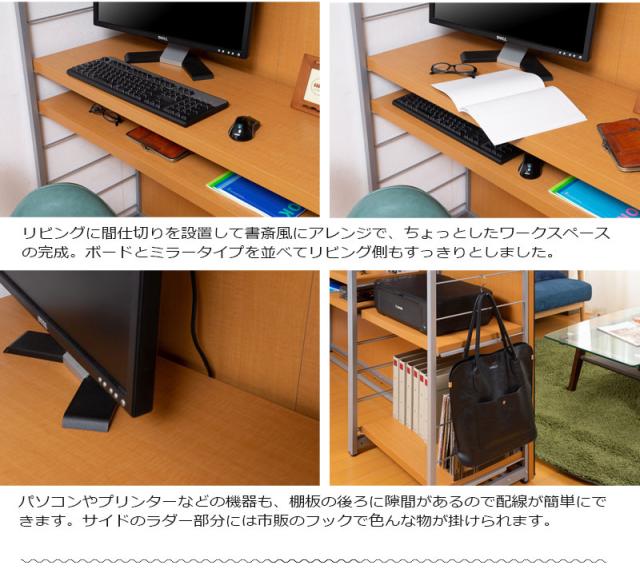 頑丈設計の間仕切りラックシリーズ。棚板厚のボリュームアップにより強度も備えた収納面に間仕切り面はすっきりとした木目調から清潔感あるホワイト色の3カラー展開。収納面はハンガーラックと4段棚の2タイプに、間仕切り面はボードと全身ミラーの2タイプをご用意。オフィスでの使用はもちろん、ご家庭でも間仕切りプラス収納で使い勝手のよいパーテーションです。ミラータイプはダンススタジオやヨガスタジオ、ダンスレッスンなどにも重宝。充実した収納&頑丈がポイント。