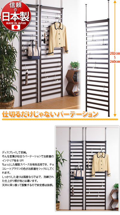 ディスプレイして収納。 そんな言葉が似合うパーテーションでお部屋のインテリア性をUP! ちょっとした壁面スペースを有効活用でき、チョコレートブラウンの色がお部屋をシックにしてくれます。 しっかりした造りは国産ならではで、洗練された仕上がり感が他とは違います。 天井に突っ張って設置できますので安定感抜群。 北欧好きやDIY好きにもオススメ! 一人暮らし・ファミリー・子供部屋からオフィスまで 新生活におすすめの高品質でおしゃれな家具・インテリア・生活雑貨の激安通販サイト、家具ドキッ!です!! なるべく安い価格でご提供するために、工場出荷(ファクトリーアウトレットシステム)でのお届けを導入しています。 | ||||