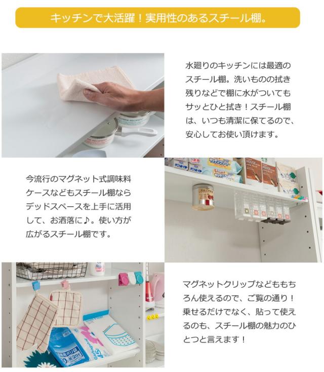 | 商品仕様 | 側板:プリント紙化粧繊維板 棚板:スチール(エポキシ樹脂粉体塗装) 棚板/可動式5枚(6cmピッチ28段階) |