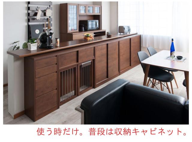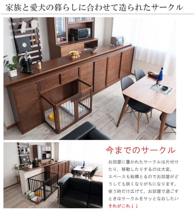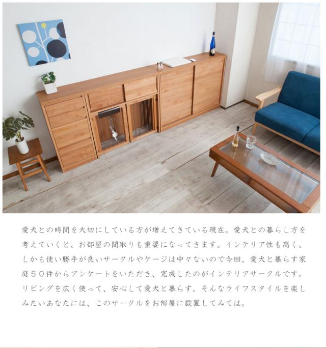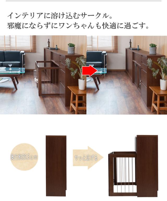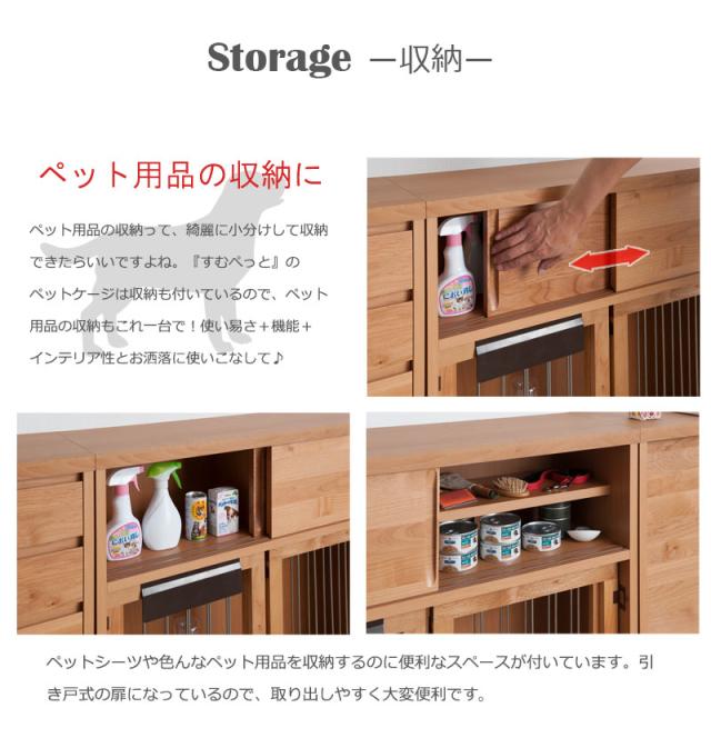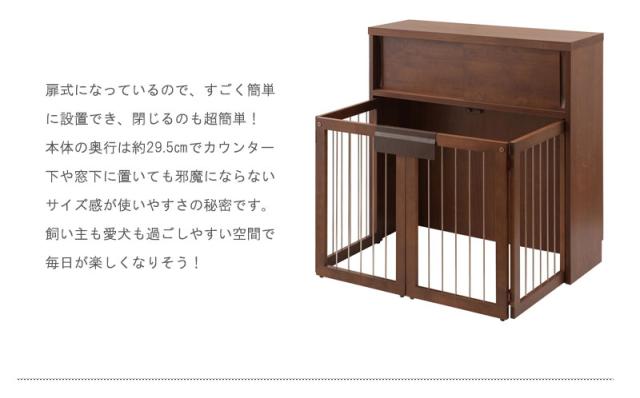 スッキリとしたデザインの扉や前板は木目の綺麗なアルダー材を使用。アルダー材特有の美しい木目をそのままいかした天然木の温かみを是非。木製ワンタッチでたたんでしまえる収納型ケージ。インテリア性も兼ね備えたペット家具『すむぺっとシリーズ』。手をかけやすく、すっきりとした掘り込みの取っ手は天然木ならではの加工。愛犬をサークルに入れるときだけ広げるので、普段は収納キャビネットのように使えるのが魅力。本体の奥行は約29.5cmでカウンター下や窓下に置いても邪魔にならないサイズ感。他のシリーズと合わせて、キッチンやリビングなどでお洒落に収納できます。