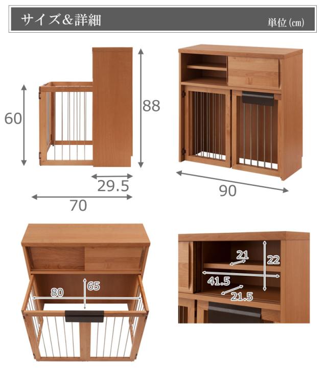 | その他サイズ | ケージ内寸/(約)幅80×奥行65×高さ60cm 扉内寸/(左右共通)(約)幅41.5×奥行21.5×高さ22cm 棚板/可動式:2枚 |