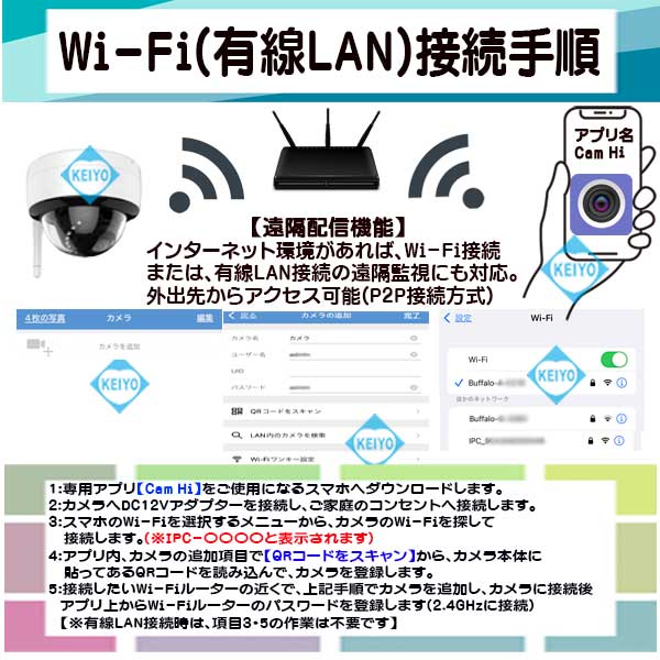 カメラはWi-Fi機能を搭載しています。(IEEE 802.11b/g/n 2.4GHz対応) カメラがWi-Fiにつながっていると、どこにいてもスマホから ライブ映像・録画データの確認を行えます。