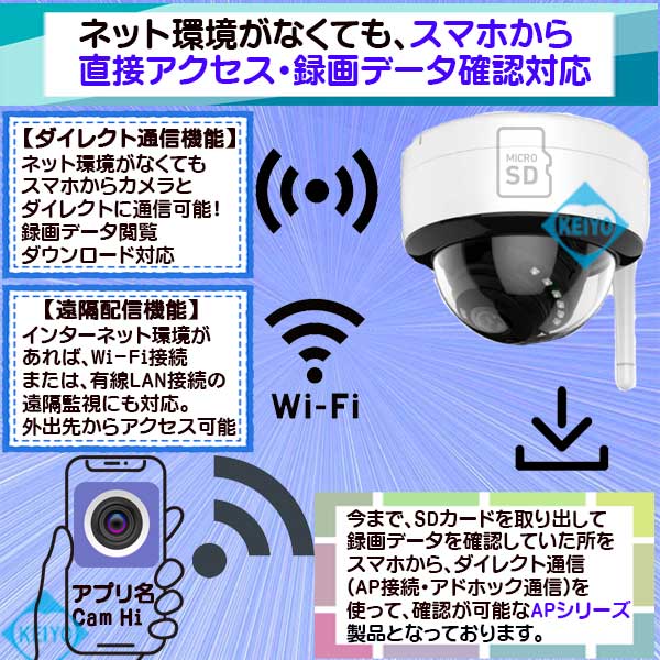 従来機種と同じように、本体内に録画機を内蔵しておりますので 電源のある場所に設置してすぐに、録画システムを構築可能な上 SDカードを取り出さなくても、スマホから録画データのダウンロードや 閲覧が可能となっております。