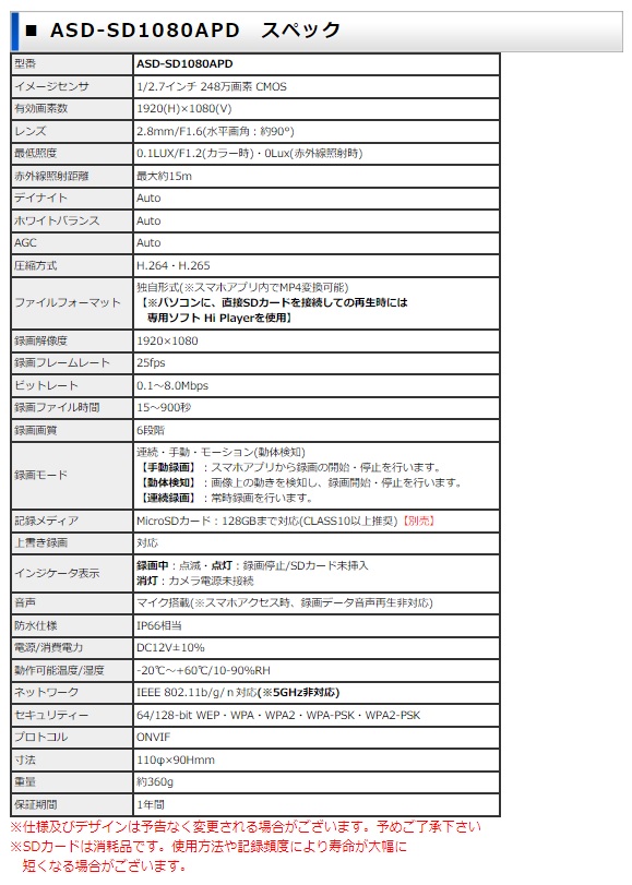 ASD-SD1080APDは、アナログハイビジョン信号の AHD1.0方式を採用した、屋外設置対応SDカード録画カメラ ASD-SD720AHDをフルHD・IPカメラ化し、遠隔監視や直接スマホから アクセスするAP接続モードに対応させた、上位機種になります。