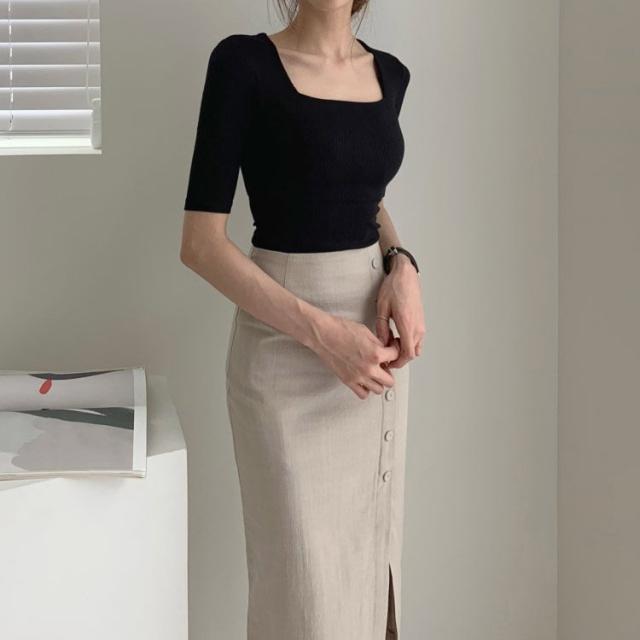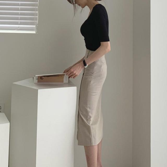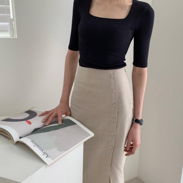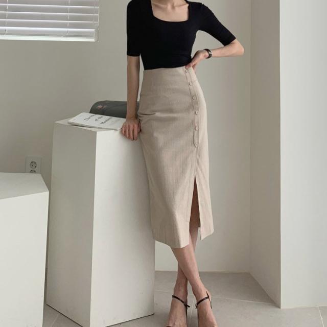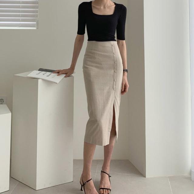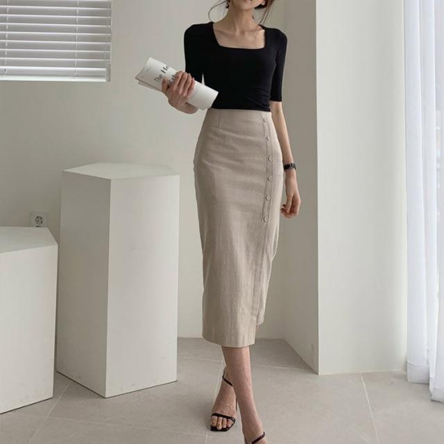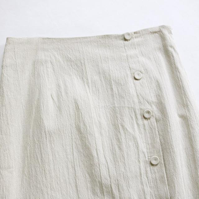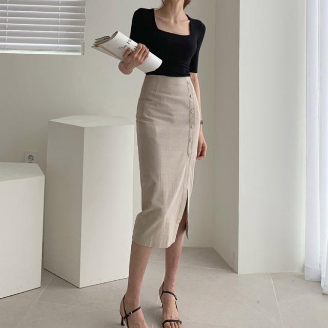 タイトスカート レディース ミモレ丈 スリット フロントボタン コットン リネン 韓国ファッション メール便