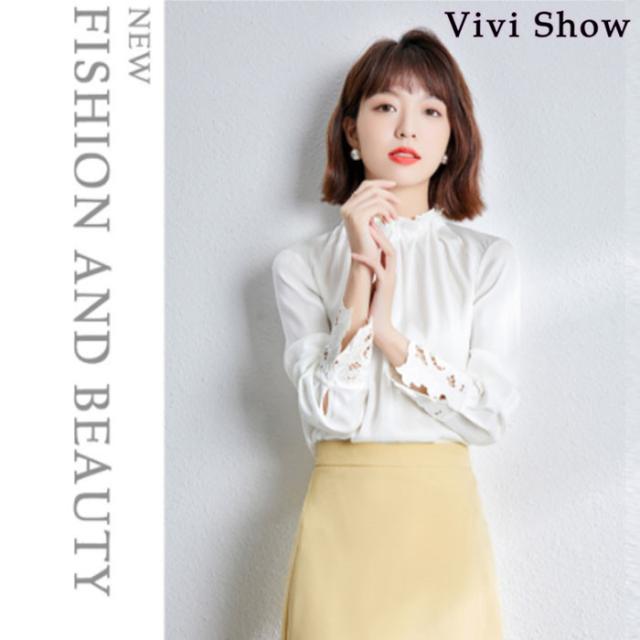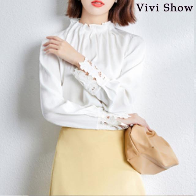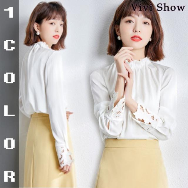 レディース レース 立ち襟 ブラウス 長袖 とろみジョーゼット ハイネック ゆったり 上品 楽ちん オシャレ