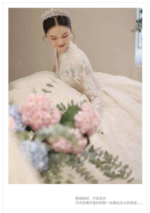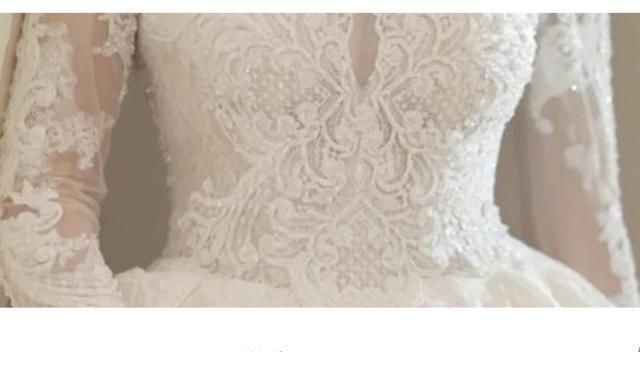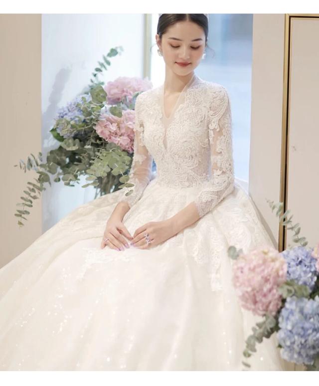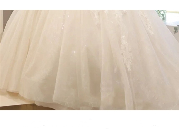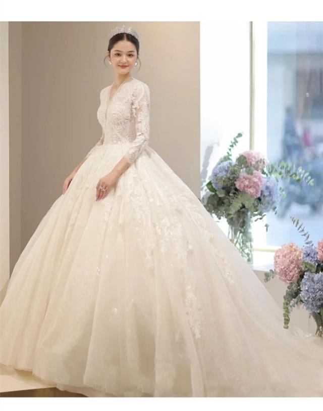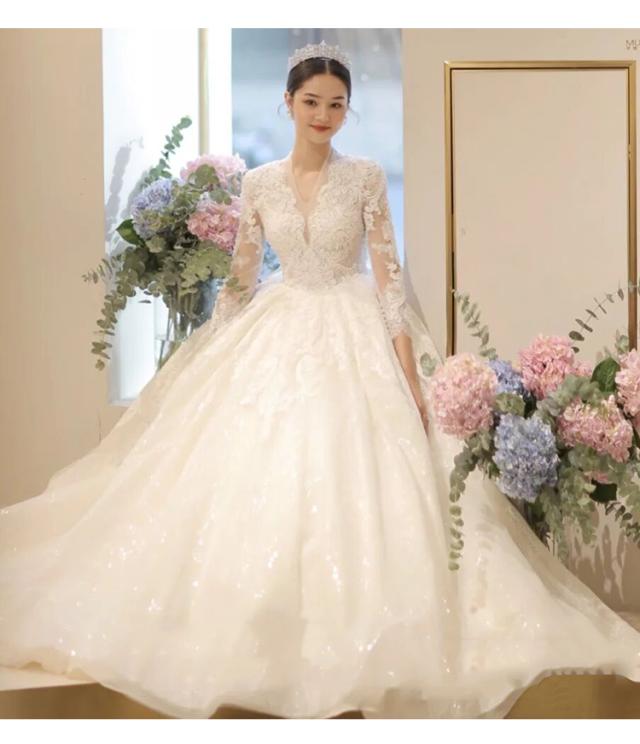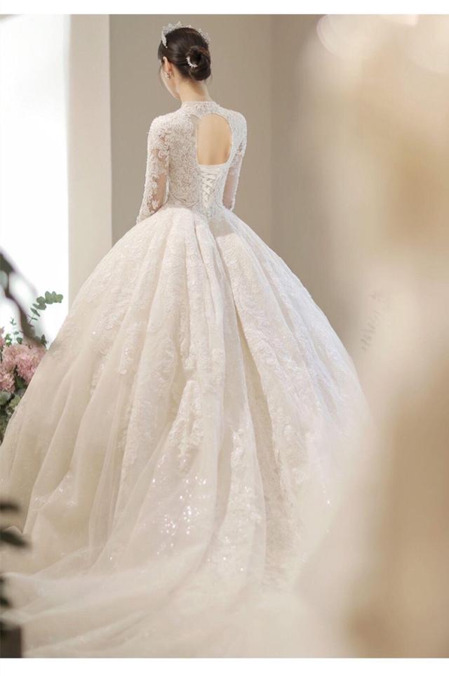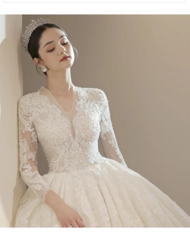 豪華 レース ウェディングドレス トレーン 7分袖 Vネック パニエ ベール グローブ付 白 大きいサイズあり 結婚式 舞台 撮影 H074b